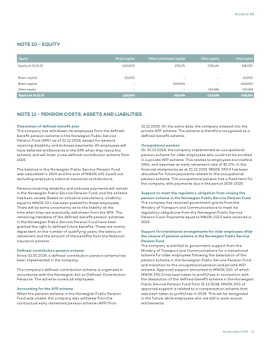 On 31.12.2018, the company implemented an occupational pension scheme for older employees who could not be enrolled in a private AFP scheme. This relates to employees born before 1964, and assumes an early retirement rate of 81.0%. In the financial statements as at 31.12.2019, MNOK 390.9 has been allocated for future payments related to the occupational pension scheme. The occupational pension has a fixed term for the company, with payments due in the period 2019-2025.