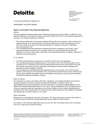 • The financial statements of the parent company Mantena AS (the Company), which comprise the We have audited the financial statements of Mantena AS showing a profit of NOK 112 486 000 in the • The financial statements of the parent company Mantena AS (the Company), which comprise the
