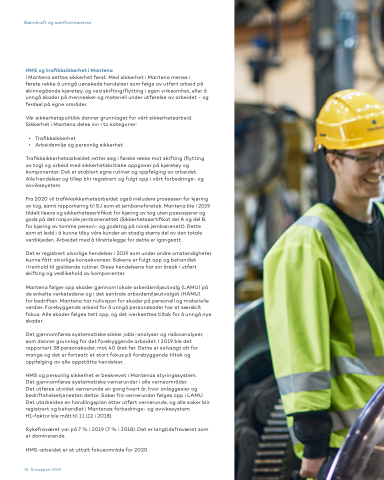 Det gjennomføres systematiske sikker jobb-analyser og risikoanalyser, som danner grunnlag for det forebyggende arbeidet. I 2019 ble det rapportert 38 personskader, mot 40 året før. Dette er selvsagt alt for mange og det er fortsatt et stort fokus på forebyggende tiltak og oppfølging av alle oppståtte hendelser.