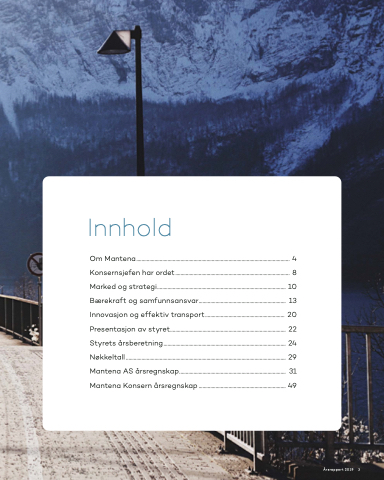Om Mantena...................................................................................................................... 4 Konsernsjefen har ordet........................................................................................ 8 Marked og strategi................................................................................................... 10 Bærekraft og samfunnsansvar................................................................... 13 Innovasjon og effektiv transport............................................................. 20 Presentasjon av styret......................................................................................... 22 Styrets årsberetning.............................................................................................. 24 Nøkkeltall........................................................................................................................... 29 Mantena AS årsregnskap.................................................................................. 31 Mantena Konsern årsregnskap ................................................................... 49