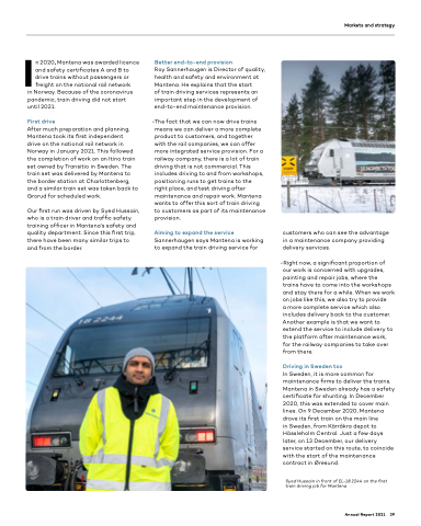 In Sweden, it is more common for maintenance firms to deliver the trains. Mantena in Sweden already has a safety certificate for shunting. In December 2020, this was extended to cover main lines. On 9 December 2020, Mantena drove its first train on the main line