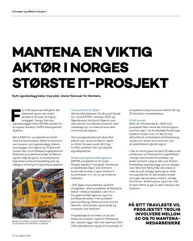 Når Nordlandsbanen fra Grong til Bodø tar i bruk ERTMS i oktober 2022 og Gjøvikbanen fra Roa til Gjøvik noen uker senere, har Mantena bidratt med installasjonen av utstyret som skal monteres på togene.