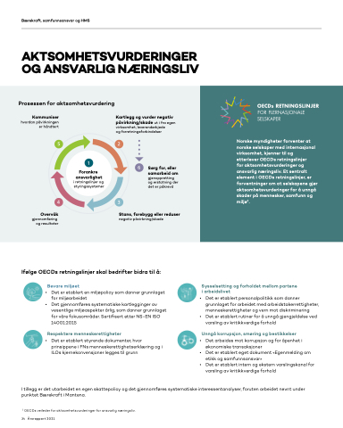 for aktsomhetsvurderinger og ansvarlig næringsliv. Et sentralt element i OECDs retningslinjer, er forventninger om at selskapene gjør aktsomhetsvurderinger for å unngå skader på mennesker, samfunn og miljø2.