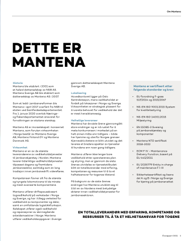 Mantena er en av de største leverandørene av vedlikeholdstjenester til jernbanekjøretøy i Norden. Mantena leverer tidsriktige vedlikeholdstjenester tilpasset dagens og fremtidens jernbanesektor, samtidig som en lang tradisjon innen jernbanedrift videreføres.