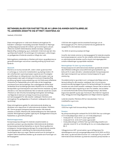 og rettferdig er et viktig element, men ikke det eneste. Lønn og kompensasjon skal være et bidrag til å motivere til bærekraftig utvikling og høyest mulig avkastning over tid. Dette skal reflekteres i kriteriene for fastsettelse på en slik måte at det langsiktige prioriteres foran det kortsiktige. Den underliggende driften skal verdsettes foran kortsiktige gevinster. Mantena har en enhetlig lønnspolitikk og et lønnssystem som skal fremme resultater og være attraktivt, men ikke lønnsledende. Når en ledende ansatt blir ansatt i Mantena er det til konkurransedyktige betingelser, lønnstillegg