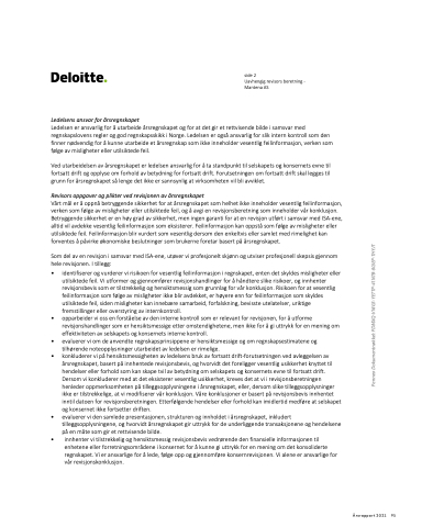 • evaluerer vi den samlede presentasjonen, strukturen og innholdet i årsregnskapet, inkludert tilleggsopplysningene, og hvorvidt årsregnskapet gir uttrykk for de underliggende transaksjonene og hendelsene på en måte som gir et rettvisende bilde.